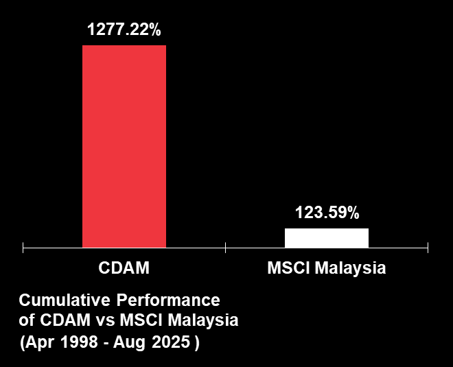 From 27 April 1998 to 31 August 2025, CDAM achieved an impressive compound return of 10.06% per annum versus a return of 2.98% for the MSCI Malaysia.
