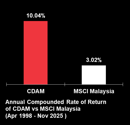 From 27 April 1998 to 30 November 2025, CDAM achieved an impressive compound return of 10.04% per annum versus a return of 3.02% for the MSCI Malaysia.